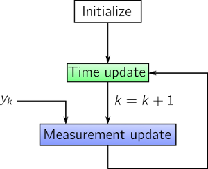 The Kalman filter consists of three phases: initialization, time update, and measurement update. The last two phases are repeated for each new measurement, see diagram illustration.